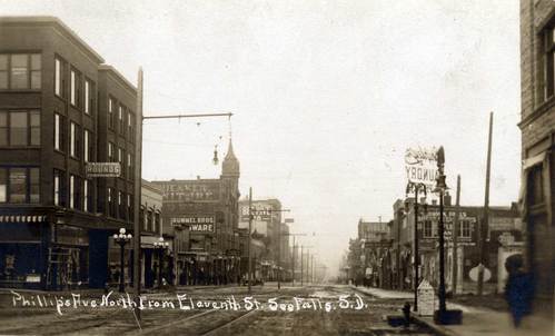 Through the mist and haze of early 1900's Phillips avenue can be seen the old Masonic Temple at 10th and Phillips ave. It would be torn down in 1929. The Bee Hive department store is a block to the north.