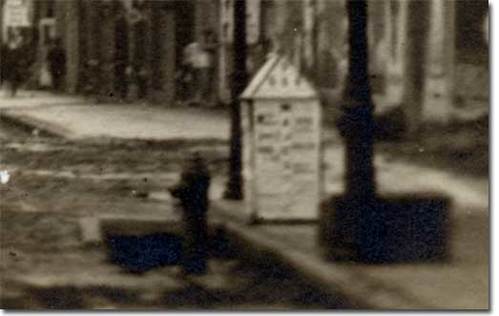 Is that a fire hydrant? In the street? It may well be; we had a bona fide fire department. There weren't too many cars around to go nuts and knock a fire plug over. As fire hydrants were first established in the city, it was easier to dig into the dirt road that was Phillips avenue to run the water lines than to put them on the sidewalk. Also there were no television cop shows to establish the trope of miscreants knocking over hydrants followed by giant gushers of water.