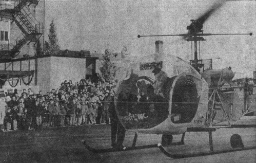 On December 14, 1957 he gave his reindeer a day off and arrived by way of helicopter on the rooftop parking lot of Northwest Security National Bank at the southwest corner of 9th Street and Main Avenue. There he met some 4,000 eager children who held his attention for the next 3 1/2 hours. He was able to make his escape at 4 PM, though not via whirlybird. Though he was still a very busy man, his staff was able to let him get away again to meet more of the children who most delight in the bright lights and wonder of the season.