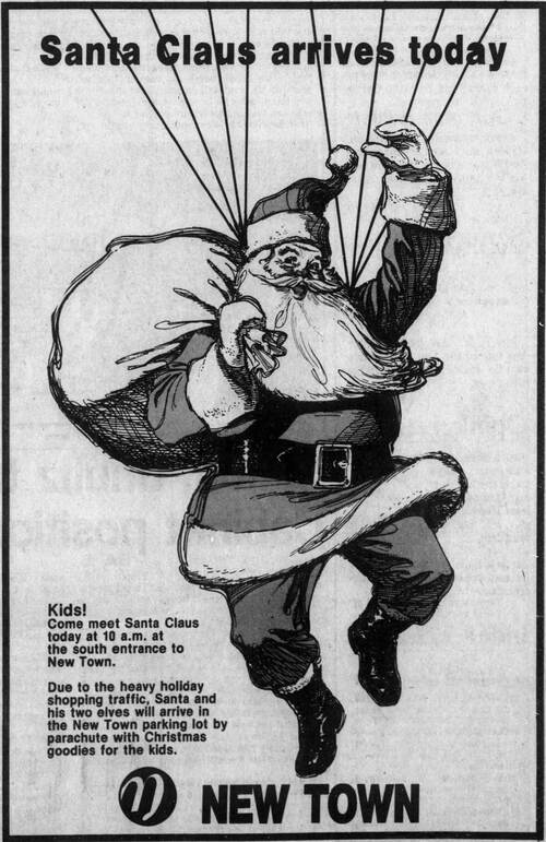 Saint Nick was finally able to chute in on November 29, 1980, shortly after the opening of the New Town Mall – currently the Empire East. The weather was with him this time as he glided in and landed lightly in the parking lot of the mall. The temperature was 35 and the winds were light. You couldn’t have asked for a more favorable beginning of the holiday season.