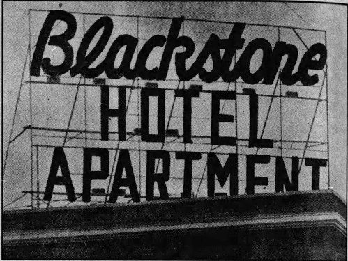 In 1941, the business model at the Blackstone had changed a bit. The complex was now known as the Blackstone Hotel and Apartments, and a new neon sign was added to the roof to help spread the word to travelers. Monthly and daily rates were established and would remain for years to come.