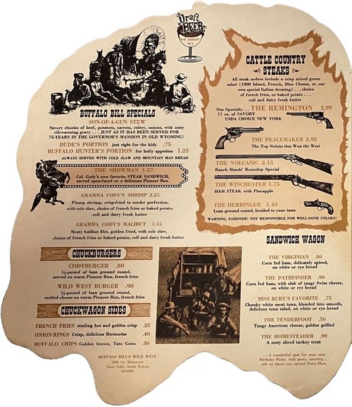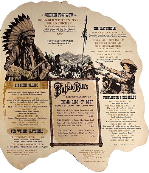 Menu for Buffalo Bill's Wild West Family Restaurant.