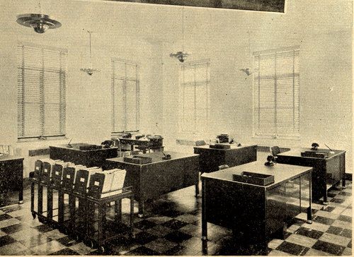 The basement contained the heating plant, water department shop, a rifle range, and garage. The ground floor held the police department, street department, building department and assessor, commissioners’ room, and offices for the treasurer, engineer, auditor, and mayor.
