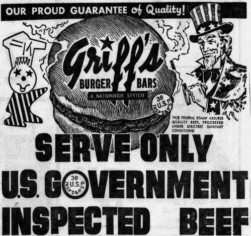 Griff's mascot was the oddly-shaped fellow to the left. He was called Griffy and he was used on the signs and in any marketing materials used by the company. As you can see, Griff's Burger Bar served only US Government inspected beef. In 1966 any meat that crossed state lines was to be inspected to ensure it fell within federal guidelines. The Meat Act of 1967 improved on this so that even meat sold within a state's borders was treated with the same scrutiny.