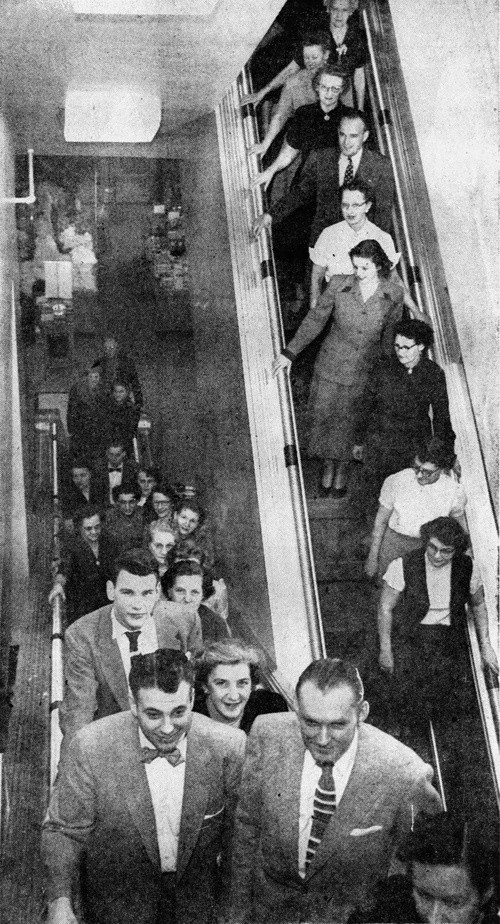 On March 19, 1953, the day of the grand re-opening, people gathered from miles around to see the new store and ride the escalator. The managers estimated that the store saw around 20,000 visitors that day - not too shabby for a Thursday. Of those, all but 3,000 were immune to the allure of the escalator.