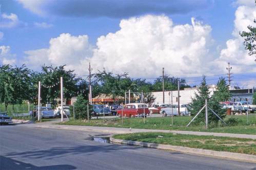 Here's the view from the street. Check out those beautiful old cars You can see the canopy from the merry-go-round there amidst the foliage. This view shows the Duluth St. entrance to Joyland park. We are looking northeast.