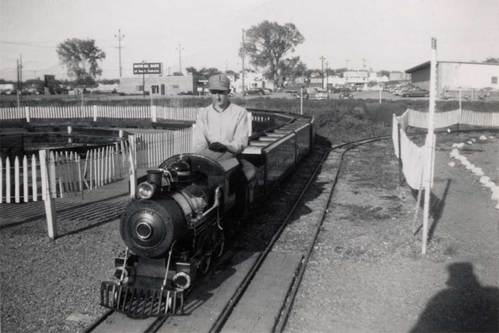 Here Jerry Parr, the founder of the feast of pictures of the fabled Joyland Park, runs the engine on the little train at Joyland Park, once located at the southeast corner of 33rd and Duluth in Sioux Falls. Right now, this space is occupied by a Breadsmith and the Natural Foods Co-Op. Certainly more nutritious, but not nearly as much fun.