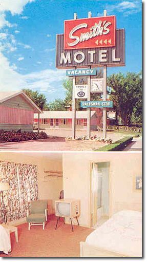 It became Smith's Budget Motel c1976. As you can see, by now the whole cabin motif was long gone. Instead, the Smith's had a couple of L-shaped buildings, all single story, and a sign you could really set your watch to! The Smith's had the blessing of the Triple A and some hotsy-totsy neon to draw the crowds. There was never a pool as far as I know, which tells us the Smith's wasn't really going for the family-fun bucks.