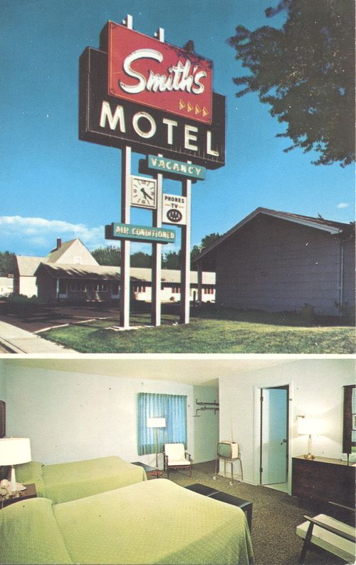 Same card, different sign. Pretty easy to paint over the sign. From the get-go Smith's cabins sported clean rooms, comfortable beds, private showers, running water, and gas heat. Sounds comfy! In about 1958 they changed the name to Smith's Uptown Motel (as opposed to Downtown, I guess).