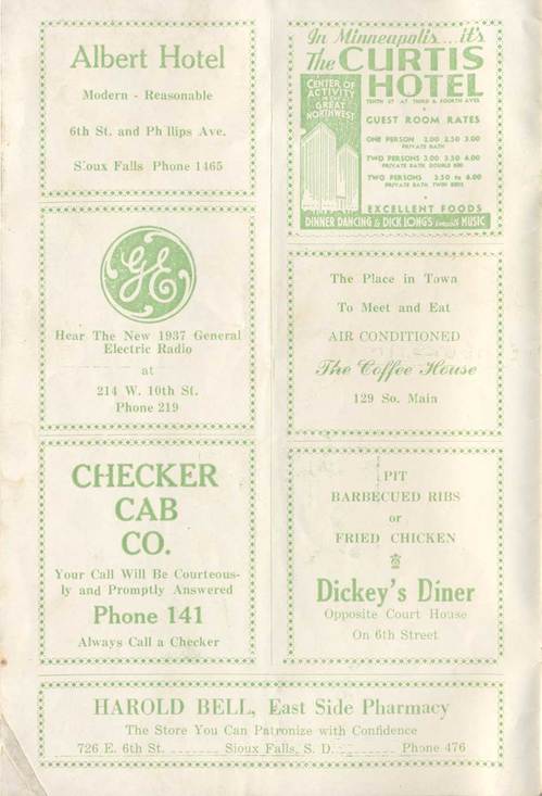 The inside cover has many advertisements. The Albert Hotel still stands in Downtown Sioux Falls, though it may not be as modern as one would like. The Curtis Hotel in Minneapolis lasted until 1984 and was, by all accounts a nice place to stay. A shiny nickel to anyone who can reveal what store was advertising the 1937 G.E. radio at 214 W. 10th! It appears we once had Checker Cabs in Sioux Falls, and also in 1936 we only needed three-digit phone numbers.