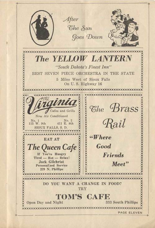 Put on your spats, honey! We're hitting the town! The Brass Rail still exists today, but I couldn't tell you if it's at the same location, because this ad doesn't let on where it is.