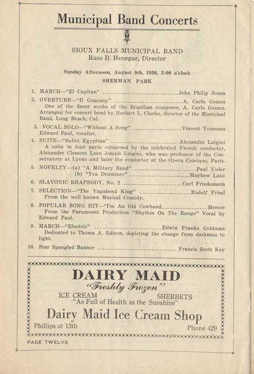 The program for the Municipal Band Concert in 1936. Enjoy! Don't forget to stop for ice cream after at the Dairy Maid. That was on the southwest corner of 13th and Phillips. KELO TV took away the ice cream when the built there.