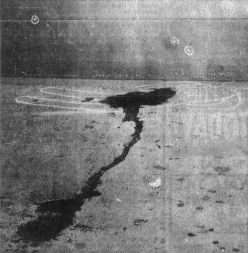 Blood trails from the chalk outline used to mark where Margaret fell in front of the Manchester Biscuit Company. Pock marks on the wall are circled with chalk to indicate where Harm's bullets struck the wall of the building. The dark splotches in the foreground came from the initial thigh wounds before Margaret fell.