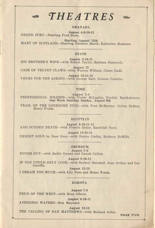 Here's a list of what's playing at the local theatres. The Granada, State, Time, Egyptian, Orpheum and Dakota theatres are represented here.