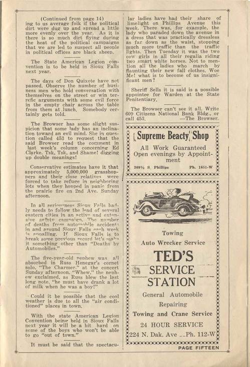 I'm VERY curious about the fourth bit on this page. I wish I had the previous issue! The comment about the 5 million grasshoppers explains the Old Timer's comments about six inches of the beasties on page 3. There was an outbreak in 1876 much worse than the one written about here.