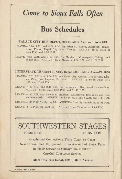 Here's your bus schedule for busses to the major metro areas around Sioux Falls. I would imagine that bus travel in 1936 is at least 75% less appealing than it is today, and bus travel these days is no treat.