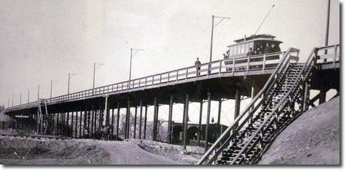 The 10th Street viaduct shown here in its youth was reinforced with steel beams, to help bear the load of trolley traffic.