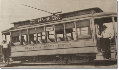 The Sioux Falls Terminal Railroad had its first run June 18, 1889. From about 11th and Phillips it ran out to South Sioux Falls. On it's first day of operation it transported 1,000 people. The trolleys were powered by hay-burning engines. At this point I haven't found any pictures of them.