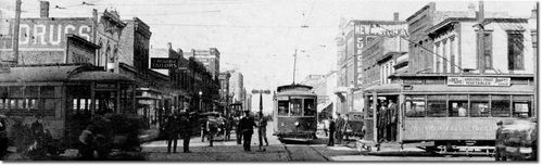 In the early days of the SFTS, poles were put up in the streets to suspend the electrical wires above the tracks. This picture dates to around 1910. There weren't too many cars on the streets at the time to make these poles a real hazard. The electric lines were suspended from the buildings and the poles removed by 1912.