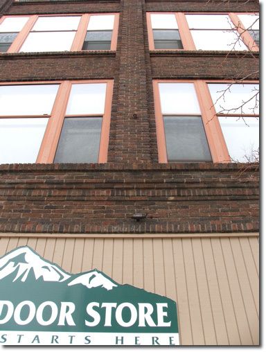 A closer look reveals an eyebolt above the Phillips street entrance to the Great Outdoor Store.