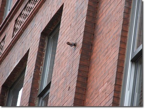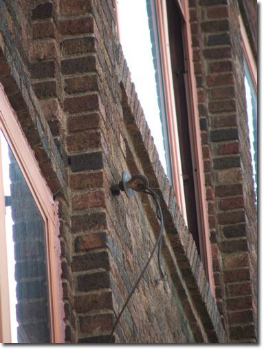 Here on the 11th St. side of the building is a wire remnant. Could this be part of the wire that suspended the Traction System's overhead trolley wire? Yep, I think so.